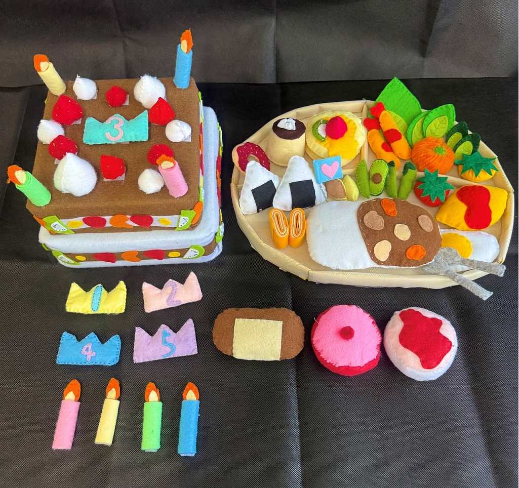 <評価ポイント> 縫製が丁寧に施されており、手縫いのエコバッグやレジのボタンの触感、ICカードまで細やかに再現された完成度の高さが際立つ。道具ひとつひとつがリアルで、ボタンを外してコンパクトに収納できる工夫は片付けの流れをスムーズにする配慮が光る。箱を開けた瞬間から「いらっしゃいませ」が始まり、子どもたちが没頭して遊び込める作品に仕上がっている。