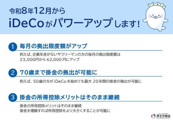 個人が資産を積み立てて運用し、老後への備えを形成することが出来る個人型確定拠出年金(iDeCo)の拠出限度額と加入可能年齢が、令和8年12月から引き上げられます。