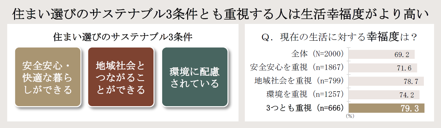 さらに、住まい選びにおけるサステナブル条件の重視度別に満足度を比較すると、「安全安心・快適な暮らし」を重視する人は73.3%、「地域社会とのつながり」を重視する人は78.0%、「環境に配慮」を重視する人は73.8%と、いずれも平均を上回る結果となりました。