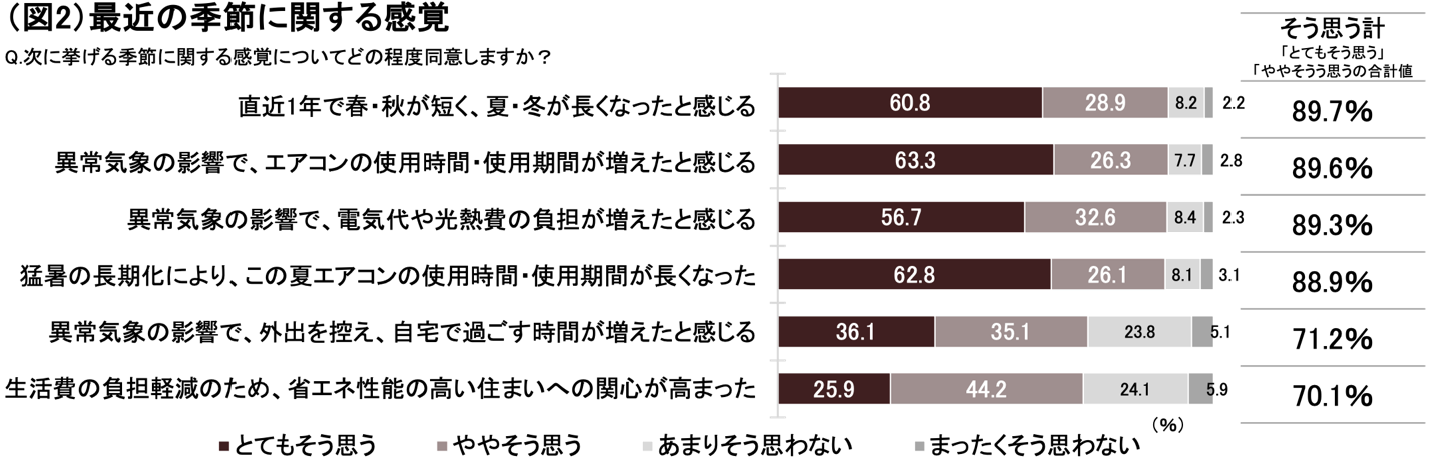 最近の気候変動について聞くと、生活の中で気候変動を実感する人が増えていることが分かりました(図2)。地球温暖化などの影響で日本の夏の期間は長期化し、一方、冬の期間はほぼ変わらないことから、春と秋が短くなっています。こうした“二季化”の進行は、肌感覚でも実感されつつあり、今後の住まいの選び方や暮らし方に大きな影響を与えると見られます。