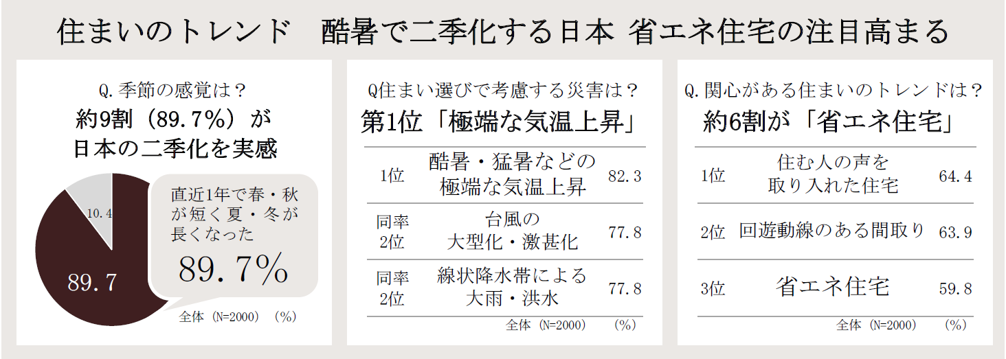 本書では20代~60代の男女2,000人を対象とした調査結果をもとに、二季化※の実感や省エネ住宅への関心、さらには“安全安心・快適さ”“地域とのつながり”“環境への配慮”の3条件が生活幸福度に与える影響など、住まい選びを巡る最新の潮流をまとめています。主な調査結果は以下の通りです。