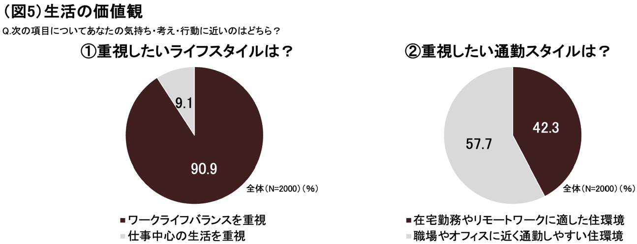 続いて、生活の価値観について尋ねました。(図5)。コロナ禍前は多くの人が通勤して働くスタイルが一般的でしたが、コロナ禍でのステイホームを経験したことで、在宅やリモートワークといった働き方の選択肢が広がりました。