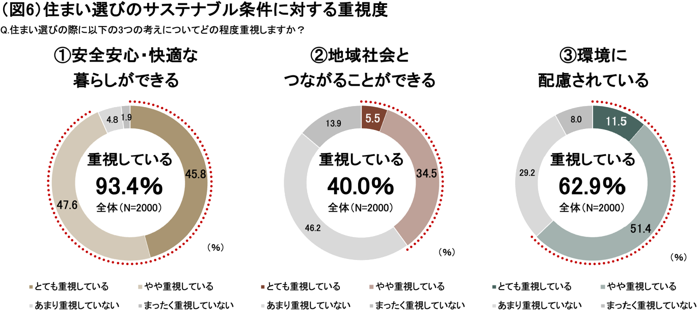 その結果、最も重視されていたのが、「安全安心・快適な暮らしができる」(93.4%)、次いで「環境に配慮されている」(62.9%)、「地域社会とつながることができる」(40.0%)の順となりました(図6)。