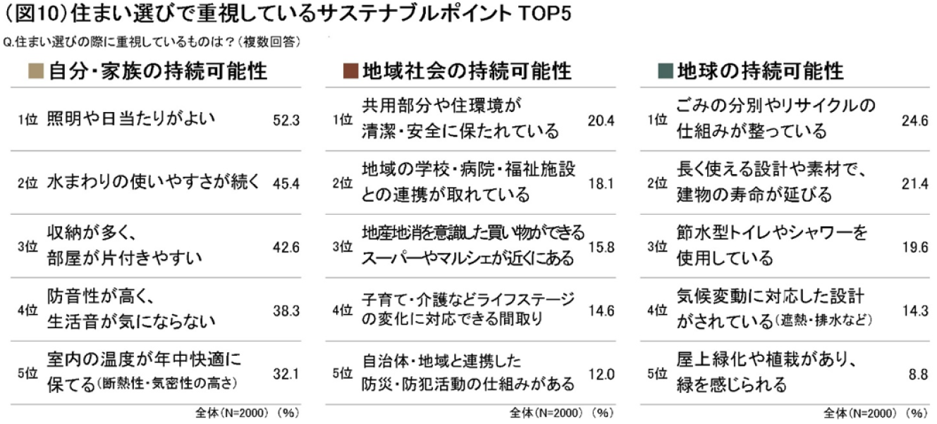 自分・家族の持続可能性では、「照明や日当たりがよい」(52.3%)、キッチン・浴室など「水まわりの使いやすさが続く」(45.4%)、「収納が多く、部屋が片付きやすい」(42.6%)が上位。地域社会の持続可能性では、「共用部分や住環境が清潔・安全に保たれている」(20.4%)、「地域の学校・病院・福祉施設との連携が取れている」(18.1%)、「地産地消を意識した買い物ができるスーパーやマルシェが近くにある」(15.8%)が挙げられています。地球の持続可能性では、「ごみの分別やリサイクルの仕組みが整っている」(24.6%)、「長く使える設計や素材で、建物の寿命が延びる」(21.4%)、「節水型トイレやシャワーを使用している」(19.6%)が上位となりました(図10)。
