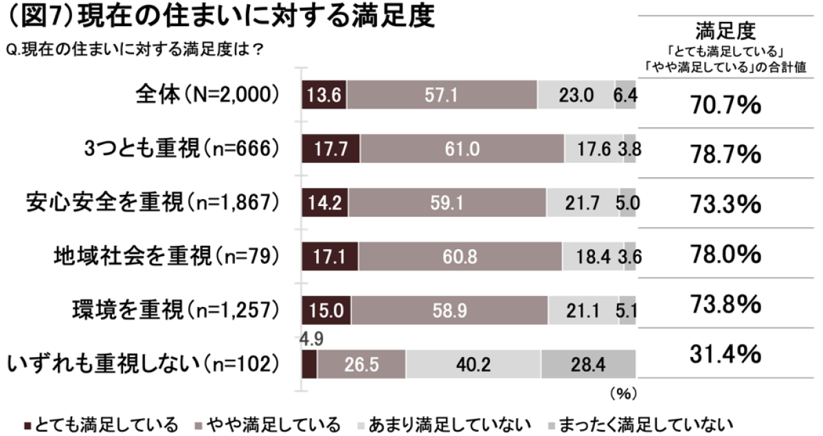 また、3つすべてを重視している人では満足度が78.7%と最も高く、逆に3つすべてを重視しない人の満足度は31.4%と大きく低いことが分かりました(図7)。