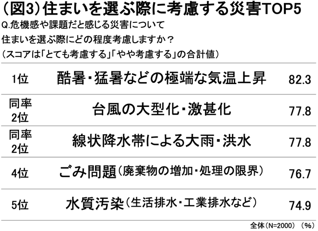 住まいを選ぶ際に考慮する災害は(図1)の「酷暑・猛暑などの極端な気温上昇」に次いで、「台風の大型化・激甚化」(77.8%)、「線状降水帯による大雨・洪水」(77.8%)が上位となりました(図3)。