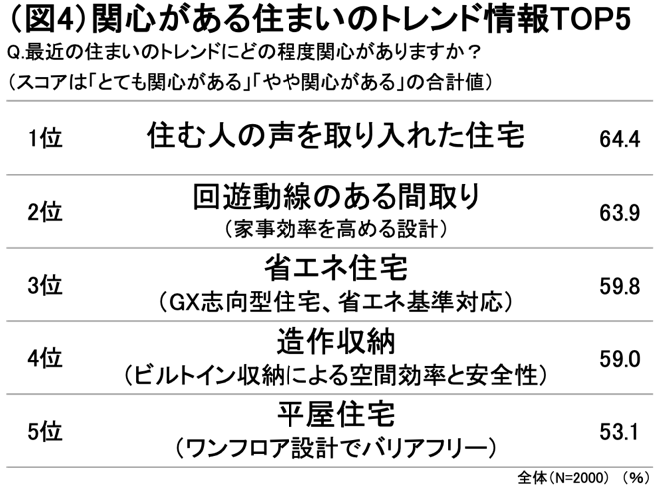 住まいに関する15のトレンド情報を提示し、関心度の高いトレンドを尋ねたところ、「住む人の声を取り入れた住宅」(64.4%)、家事効率を高める「回遊動線のある間取り」(63.9%)、GX志向型住宅、省エネ基準対応などの「省エネ住宅」(59.8%)が上位に選ばれました(図4)。