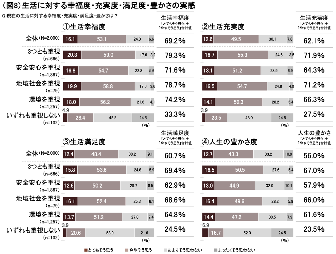 生活に対する幸福度、充実度、満足度、豊かさについて4段階で聞くと、「生活幸福度」69.2%、「生活充実度」62.1%、「生活満足度」60.7%、「生活の豊かさ」56.0%となりました。これらを、住まい選びでサステナビリティの3条件(安全安心・快適/地域社会とのつながり/環境配慮)をどれだけ重視しているかで比較すると、3つすべてを重視する人は4項目すべてで最も高い値を示しました。