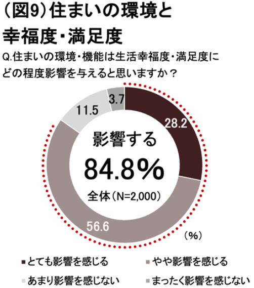 2つを重視する層も平均より高い傾向にありますが、3つを重視する層が最も生活の質の実感が高いことがわかります(図8)。さらに、住まいの環境や機能が生活の幸福度や満足度に影響するかと尋ねたところ、84.8%が「影響する」と回答しました(図9)。
