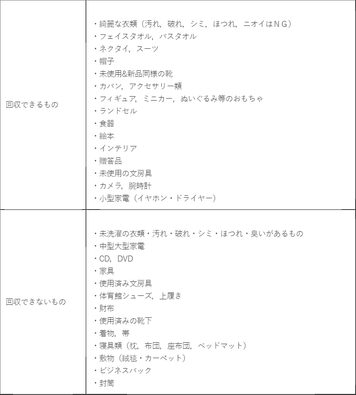 衣服だけでなく,おもちゃ,ぬいぐるみ,バッグ(ランドセルを含む),靴,アクセサリー,生活雑貨など,多様な品目に対応。
