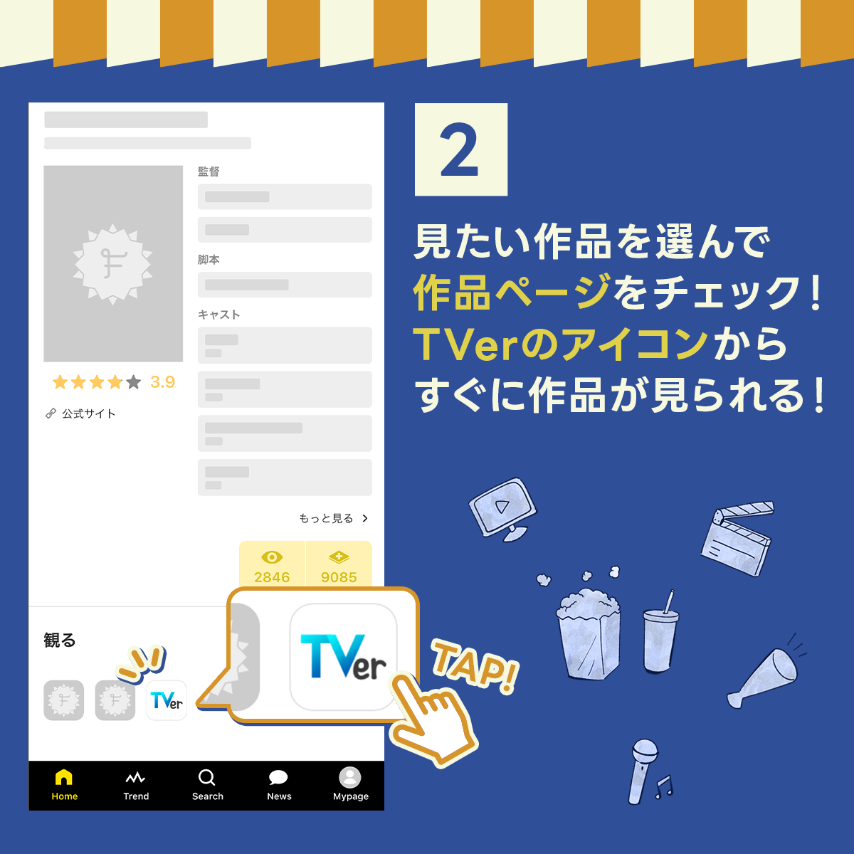 TVerで配信中の作品一覧を見るには、Filmarks WEBサイトにある「ドラマ」「アニメ」それぞれのタブ、もしくはFilmarksアプリの「Search」タブから、「TVer」を選択します。