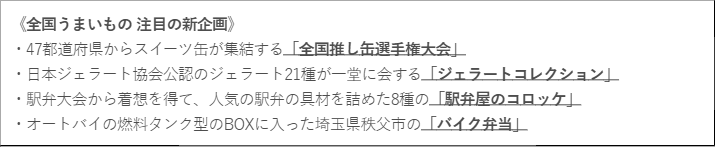 今大会では、駅弁大会に毎年お越しくださるお客様はもちろん、駅弁を食べたことがない若い方など、幅広い世代のお客様に楽しんでいただけるよう、「全国うまいもの」でも新企画を多数展開。