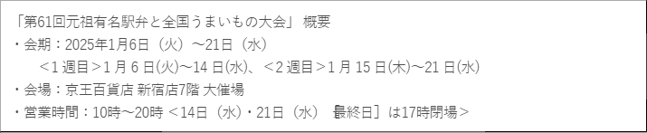 京王百貨店 新宿店では、当社の物産展として最大級の規模・売上を誇る、年に一度の名物催事 「元祖有名駅弁と全国うまいもの大会」(以下、駅弁大会)を、1月6日(火)~21日(水)の16日間で開催します。