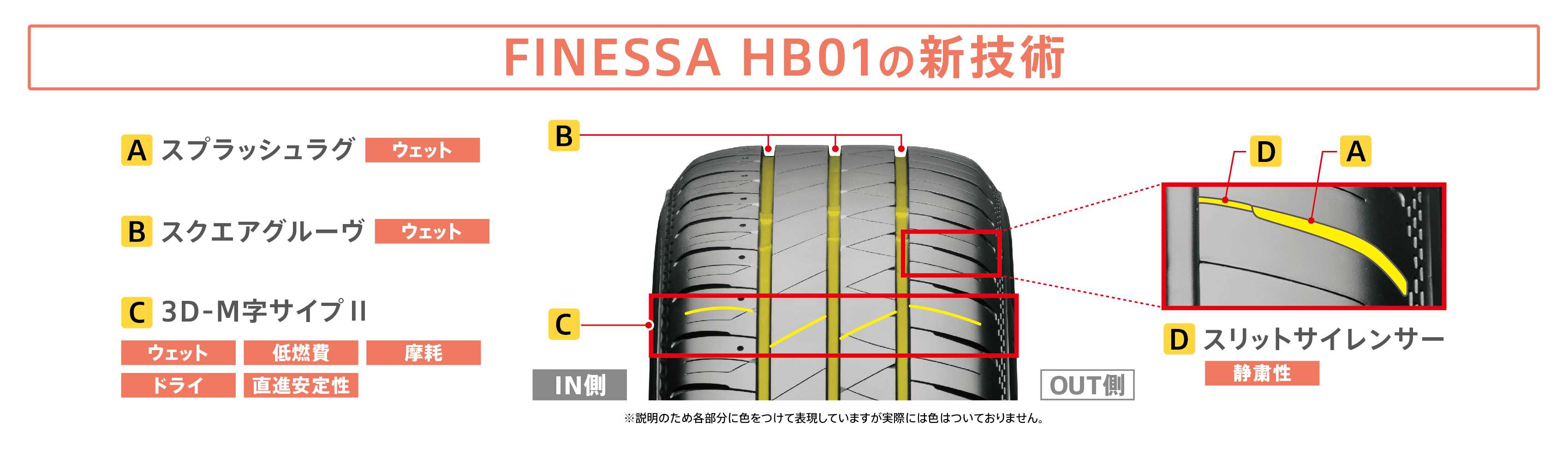 今回発売する「FINESSA HB01」は、商品設計基盤技術「ENLITEN」※1を搭載し、お客様ニーズの高いウェットグリップ性能と快適な車内空間を実現する静粛性を高め、コストパフォーマンスにも優れた商品です。