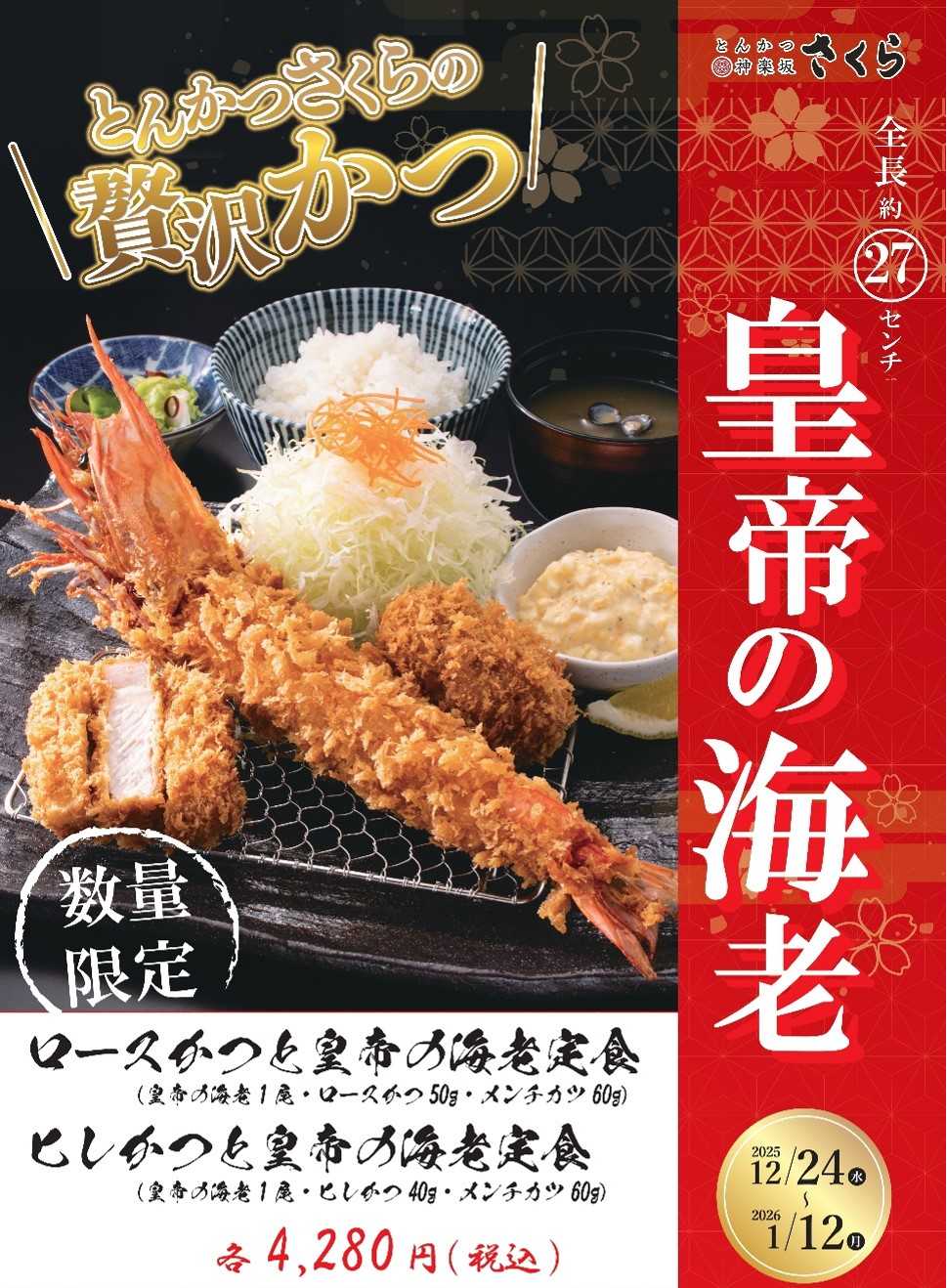 コロワイドグループの株式会社レインズインターナショナルが展開する「とんかつ神楽坂さくら」では、年末年始の特別な外食シーンに合わせ、 2025年12月24日(水)から2026年1月12日(月)までの期間限定で「皇帝の海老」のフライを販売いたします。