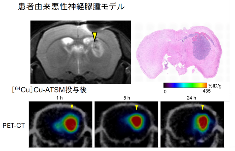 患者由来悪性神経膠腫(PDX)モデルで、[⁶⁴Cu]Cu-ATSM は 腫瘍全体に迅速に拡散、長時間滞留するのをPET/CTで確認、局所投与で有意な生存期間延長効果を示した(図2,3)