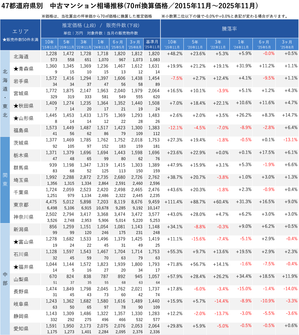 「不動産×WEB×ビッグデータ」の領域で、さまざまな不動産テックサービスを展開する株式会社ワンノブアカインド(本社:東京都港区、代表取締役社長:川島 直也、以下当社)は、当社が運営しているマンション情報サイト「マンションレビュー」の保有データを元に、全国の2025年11月の中古マンション相場を調査。坪単価をベースに70㎡での価格に換算した「中古マンション価格」*1について、10年前・5年前・3年前・前年からの推移を都道府県別・エリアごとにまとめましたので、発表いたします。