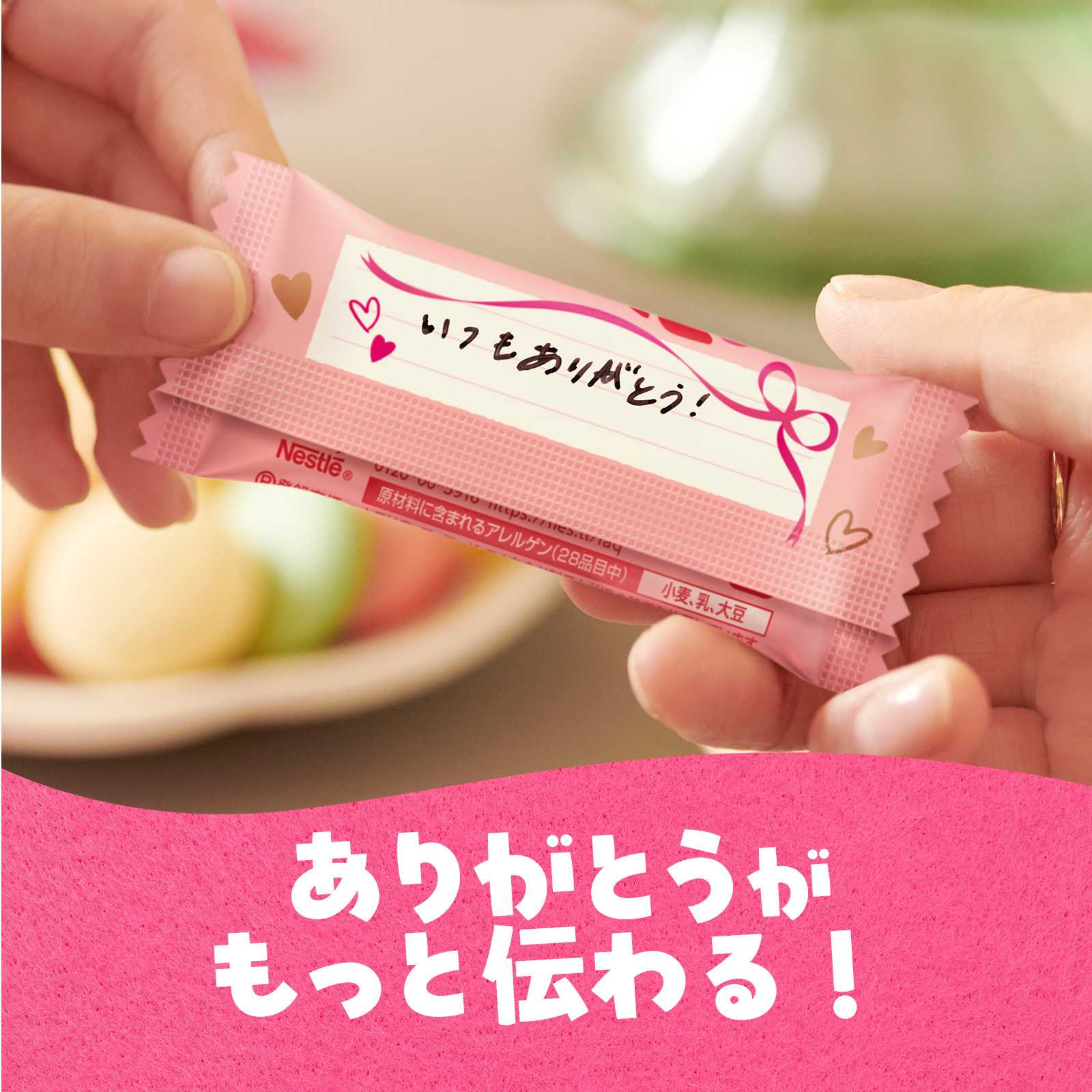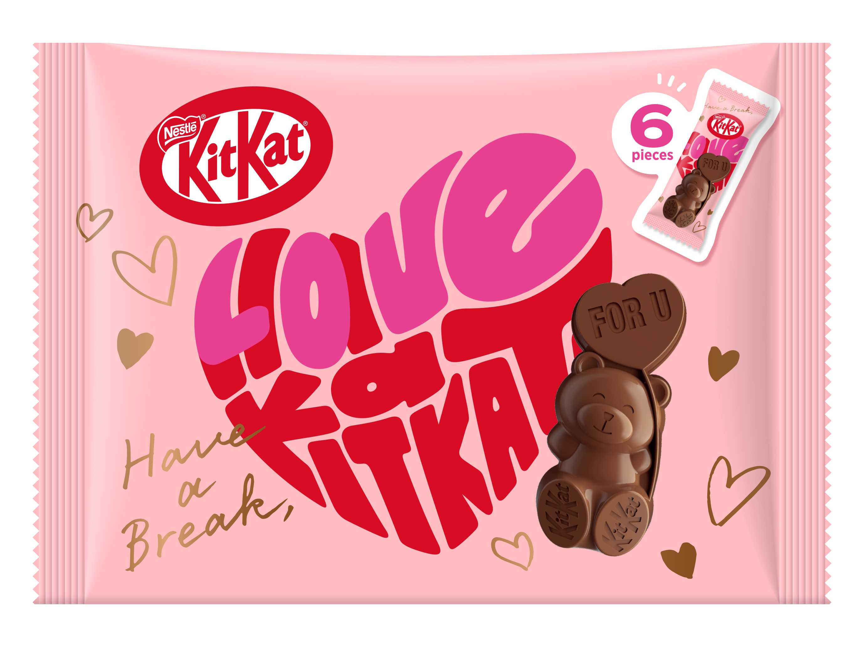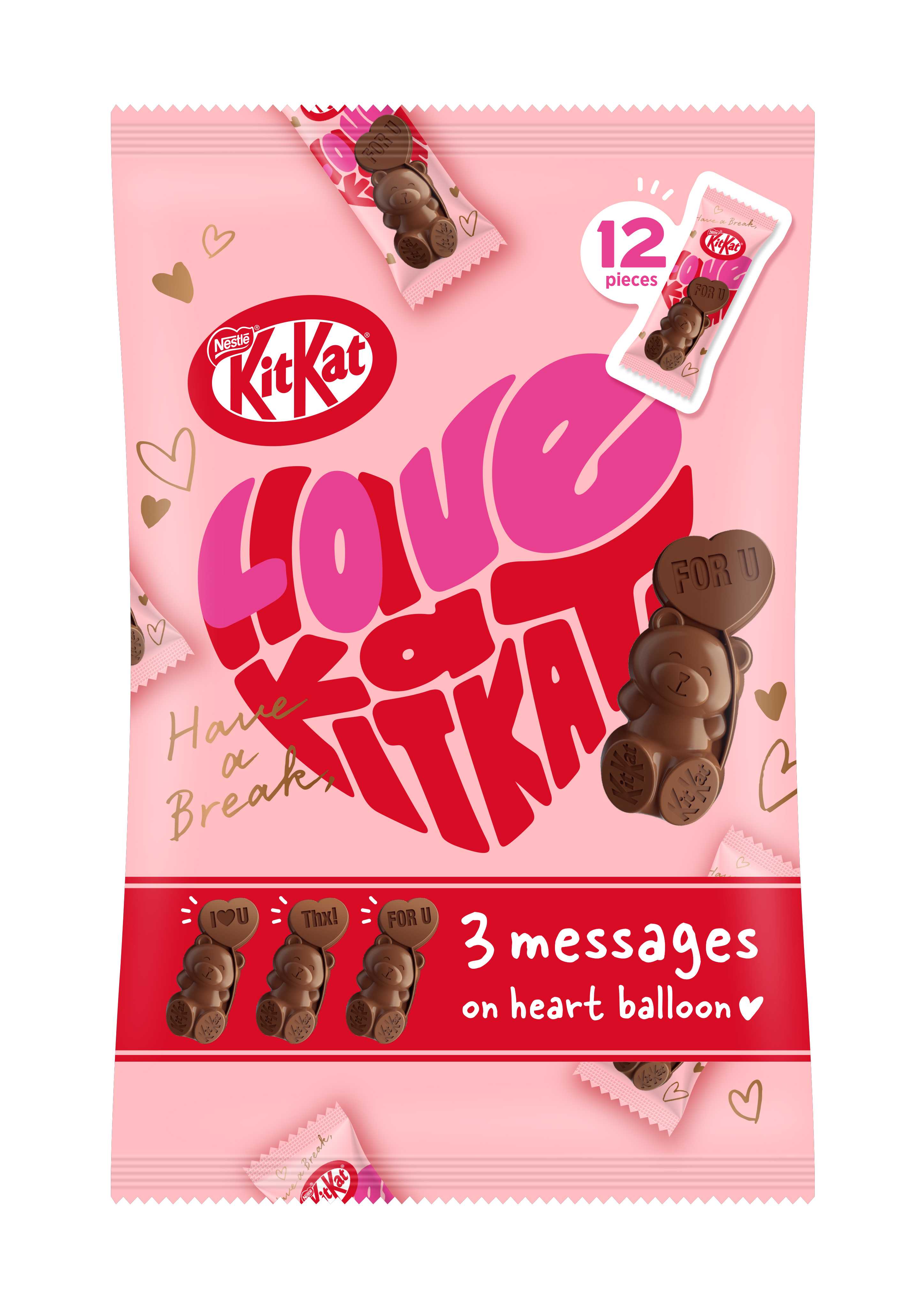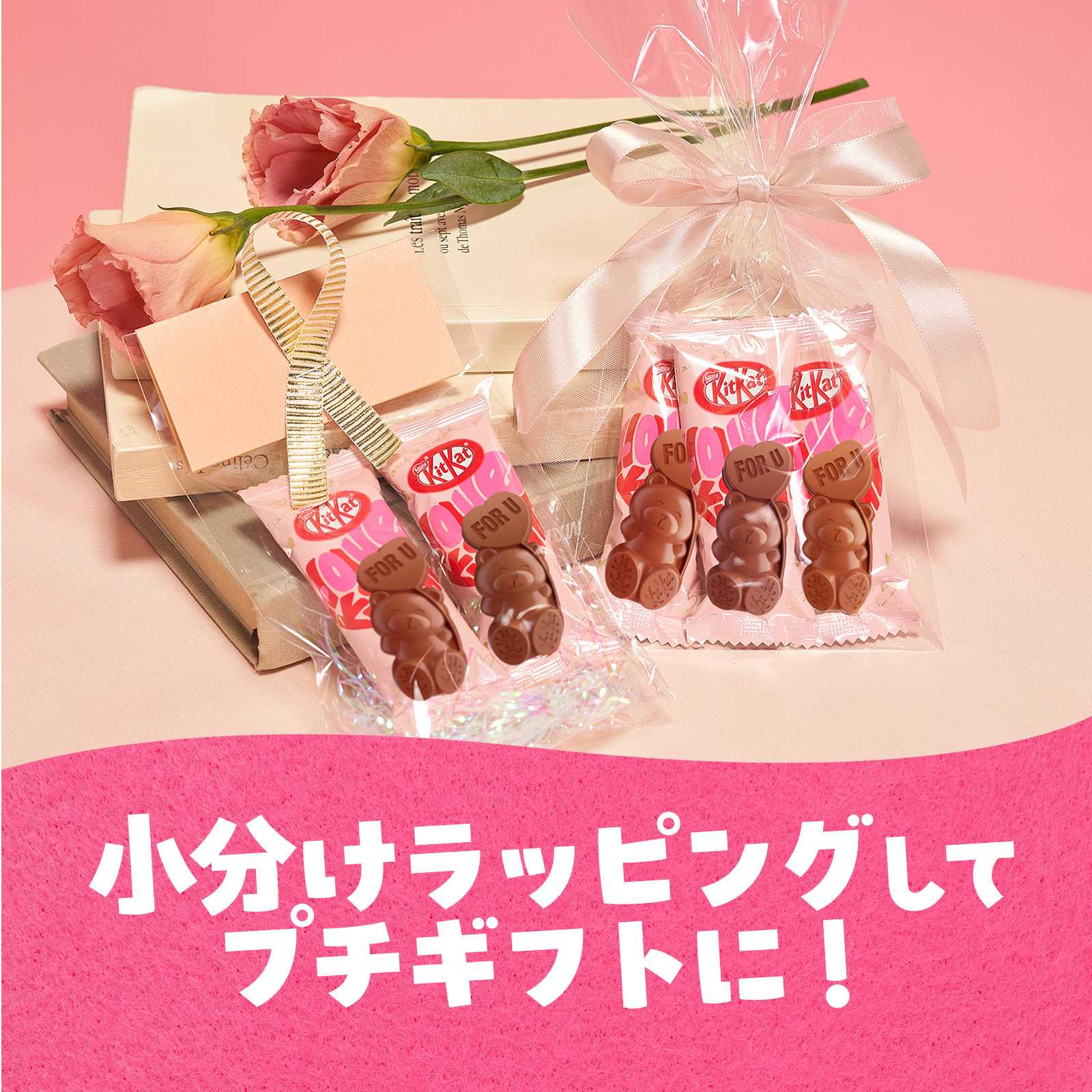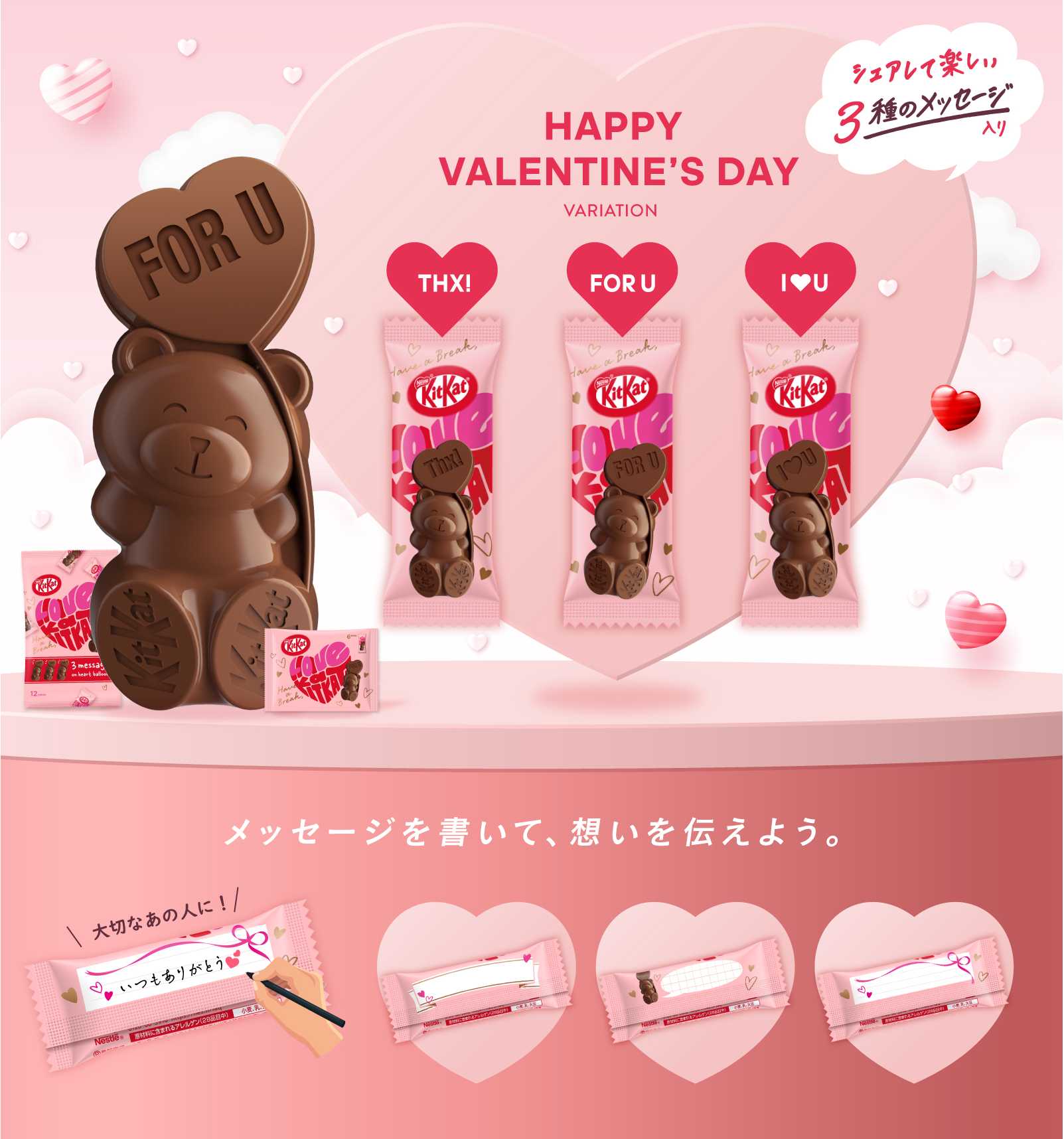 各製品の個包装正面には“I♡U”、“Thx!”、“For U”など、3種類のメッセージがデザインされています。また、裏面には、手書きメッセージ欄もあり、日頃の感謝の気持ちなどをカジュアルに伝えることができます。その他、ケーキに“クマ型キットカット”を飾ったり、手作りお菓子やデザートのデコレーション素材として活用するなど、可愛さと手軽さを兼ね備えたバレンタインを提案していきます。