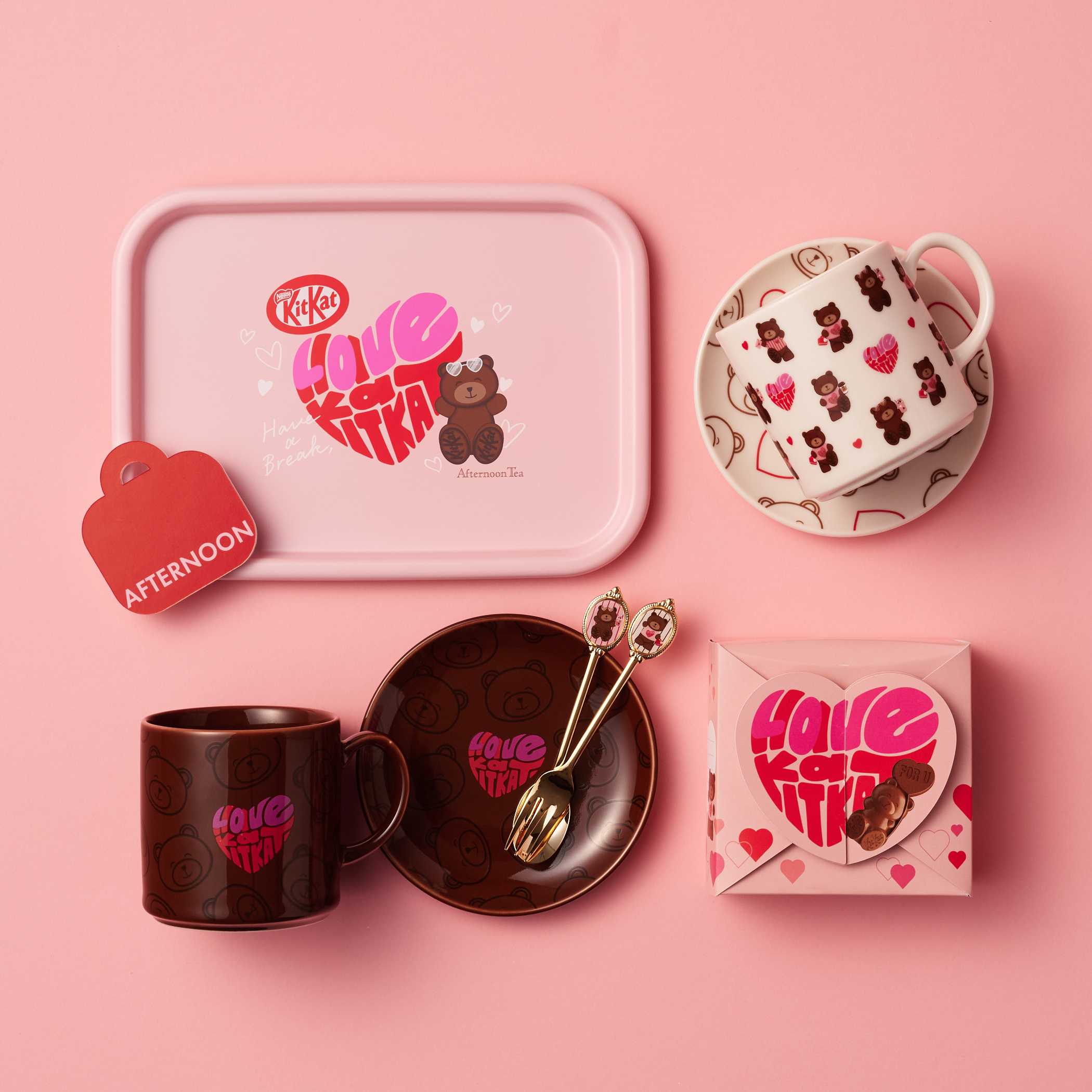 (左下)・キットカット ハートフルベアー マグカップ ブラウン(1,980円)/・キットカット ハートフルベアー ケーキプレート ブラウン(1,540円)/・キットカット ハートフルベアー ケーキフォーク(990円)/・キットカット ハートフルベアー ティースプーン(990円)