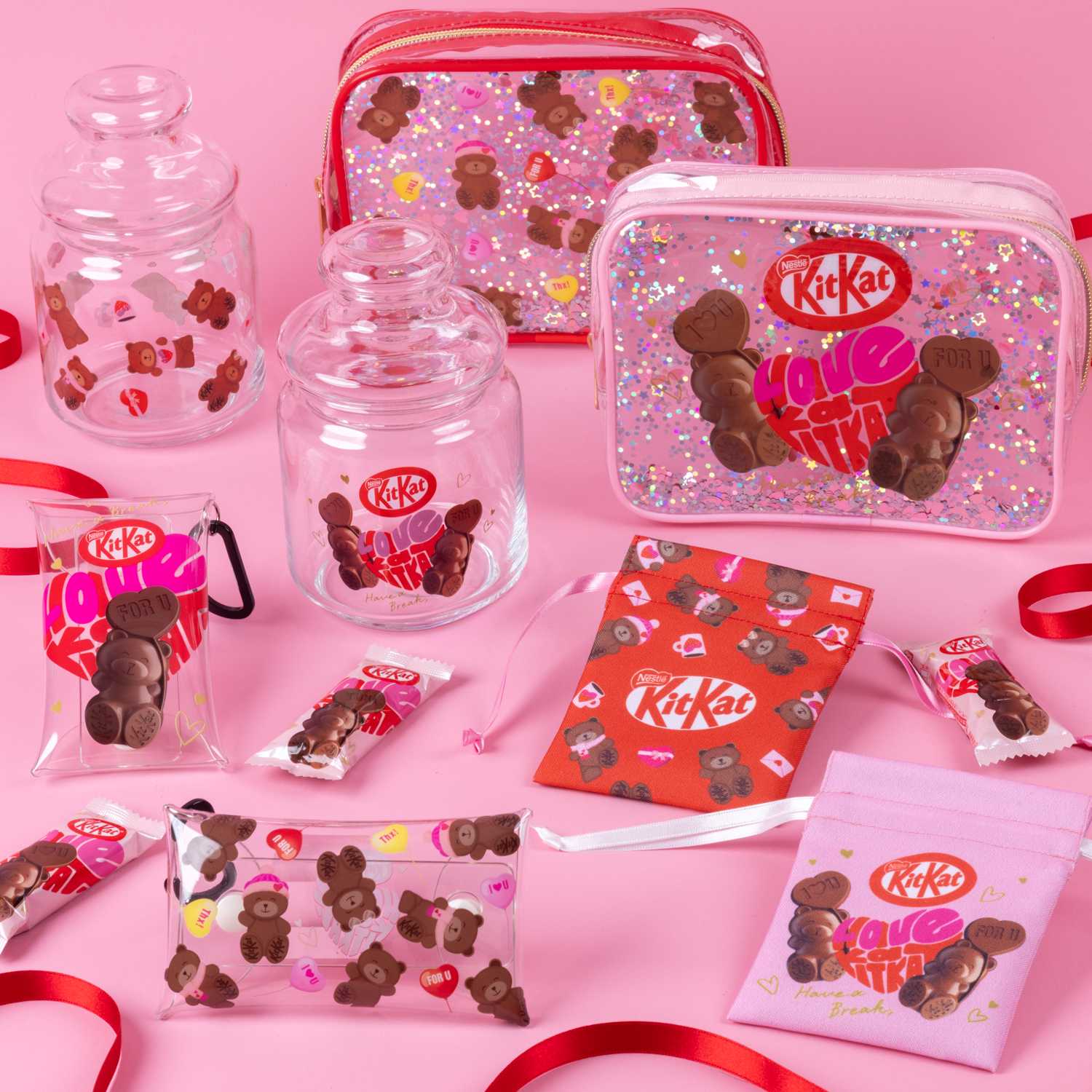 「キットカット ハートフルベアー」をデザインしたクリアマルチケースやガラス小物入れ、アクリルキーホルダーなど、生活を彩るかわいい雑貨が新登場します。
