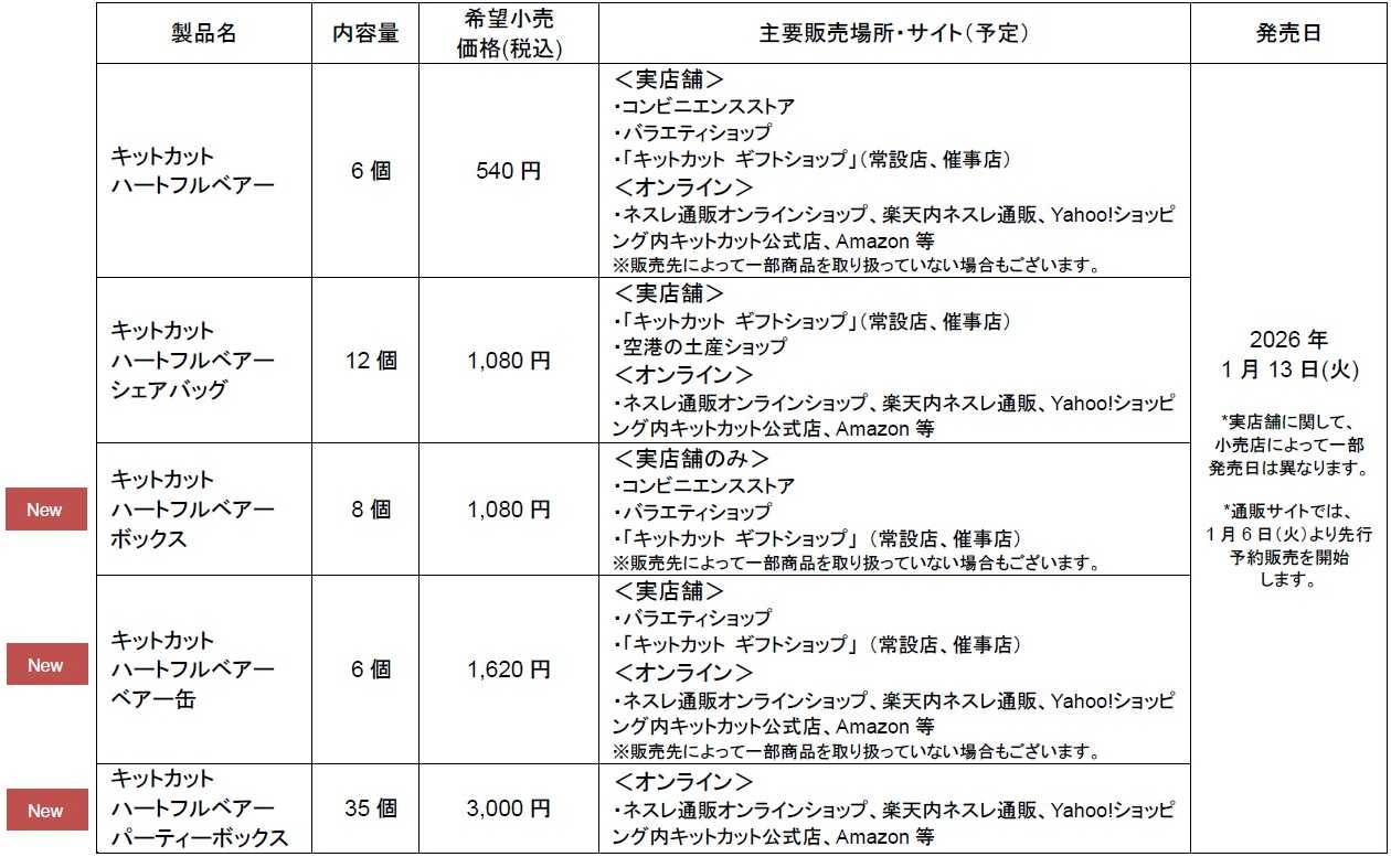 ネスレ日本株式会社(本社:兵庫県神戸市、代表取締役 社長 兼 CEO: 深谷 龍彦、以下「ネスレ日本」)は、“クマ型キットカット”「キットカット ハートフルベアー」の販売を、1月13日(火)よりシーズン限定で開始します。今年は、クマの形が愛らしい“ベアー缶”やAfternoon Tea LIVING(アフタヌーンティー・リビング)とのコラボグッズなど、ギフト映えする新アイテムが多数登場します。
