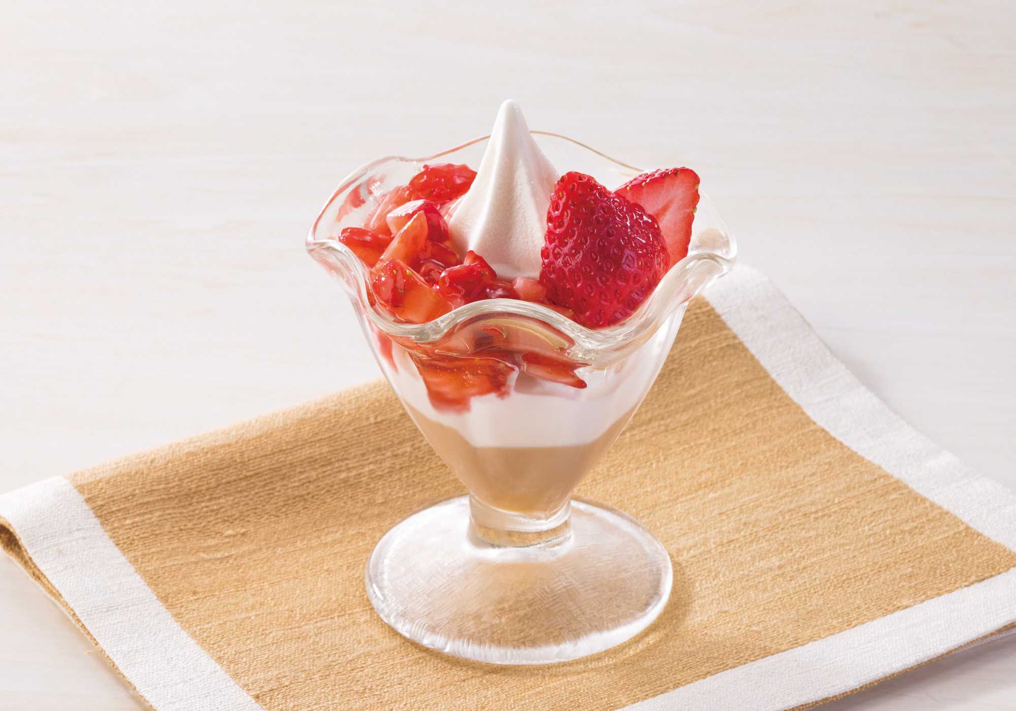 新鮮な旬の国産いちごをたっぷり味わっていただけるよう、6粒のいちごを使用した豪華なパフェです。いちごをごろっとグラスに入れ、ホイップクリームとざくざく食感のワッフルコーン、上には牛乳本来の甘さを引き立てた北海道牛乳ソフトと、程よい酸味のストロベリーソースをかけました。