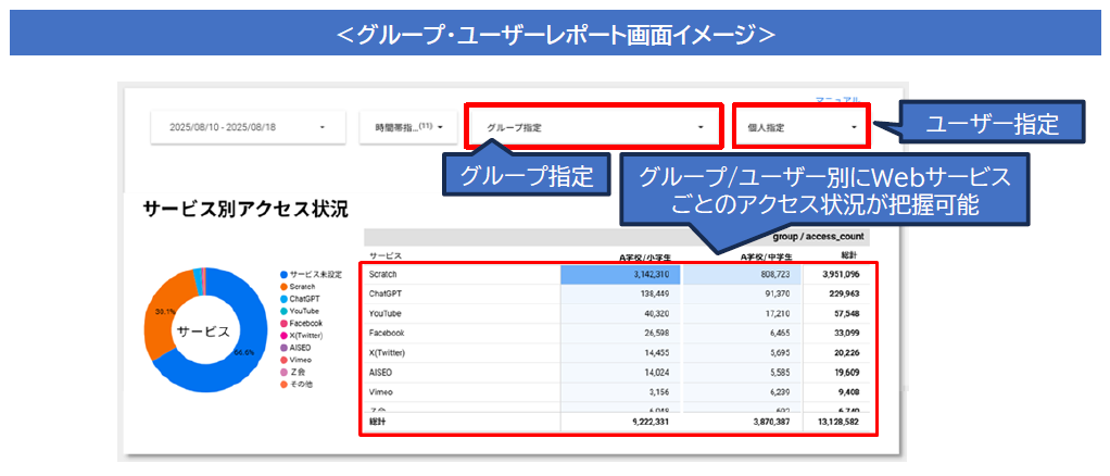 これまで提供していたグループ・ユーザー別レポートを強化し、可視化機能を追加しました。指定した学校・学年・クラスなどのグループ単位、特定の児童・生徒などユーザー単位で絞り込みができるようになり、グループ・ユーザー別にWebサービスごとのアクセス数を可視化できます。これにより、生徒が授業以外の時間帯にどのようなWebサービスを使っているかなど利用状況を詳細に分析することが可能です。