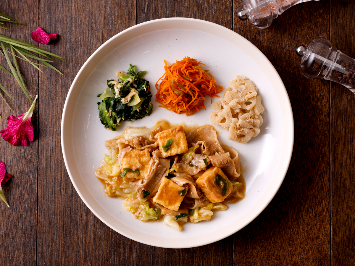 副菜は、しろ菜とチキンの和え物、塩気がアクセントの人参とザーサイ、シャキシャキ食感のレンコンのごま和えです。