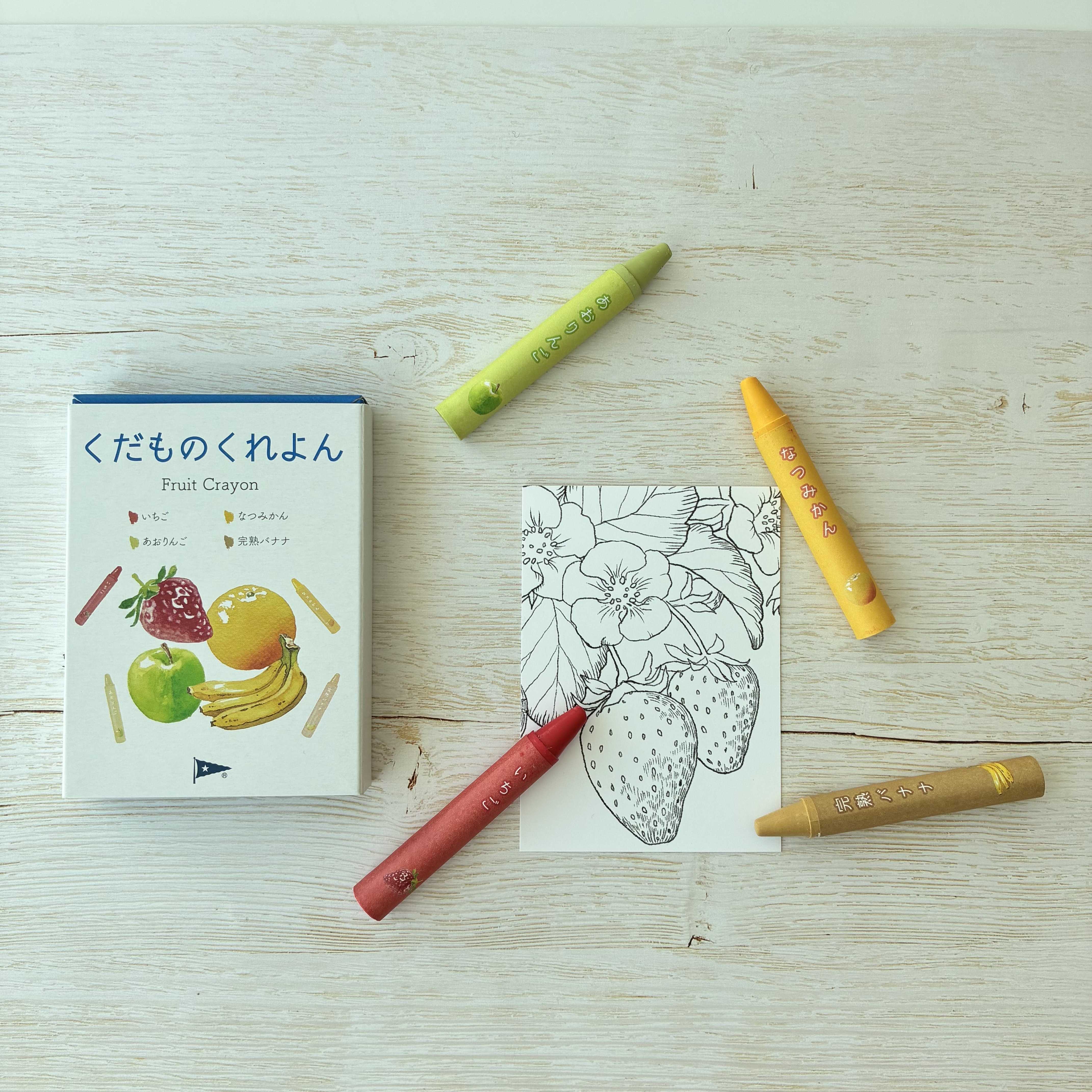 「くだものくれよん」の原料は全て天然由来の成分で、米ぬかから採れた米油とライスワックスをベースに、製造工程等で廃棄されるフルーツの一部を乾燥パウダーにしてクレヨンに混ぜています。原料となるフルーツの色を活かした4色(赤・黄・緑・茶)セットです。この4色を使うとイチゴが描けるようになっており、開封後すぐに楽しめるようイチゴの塗り絵を同封しました。自然の恵みに感謝し、フルーツを大切にしたいというアヲハタの想いが込められています。