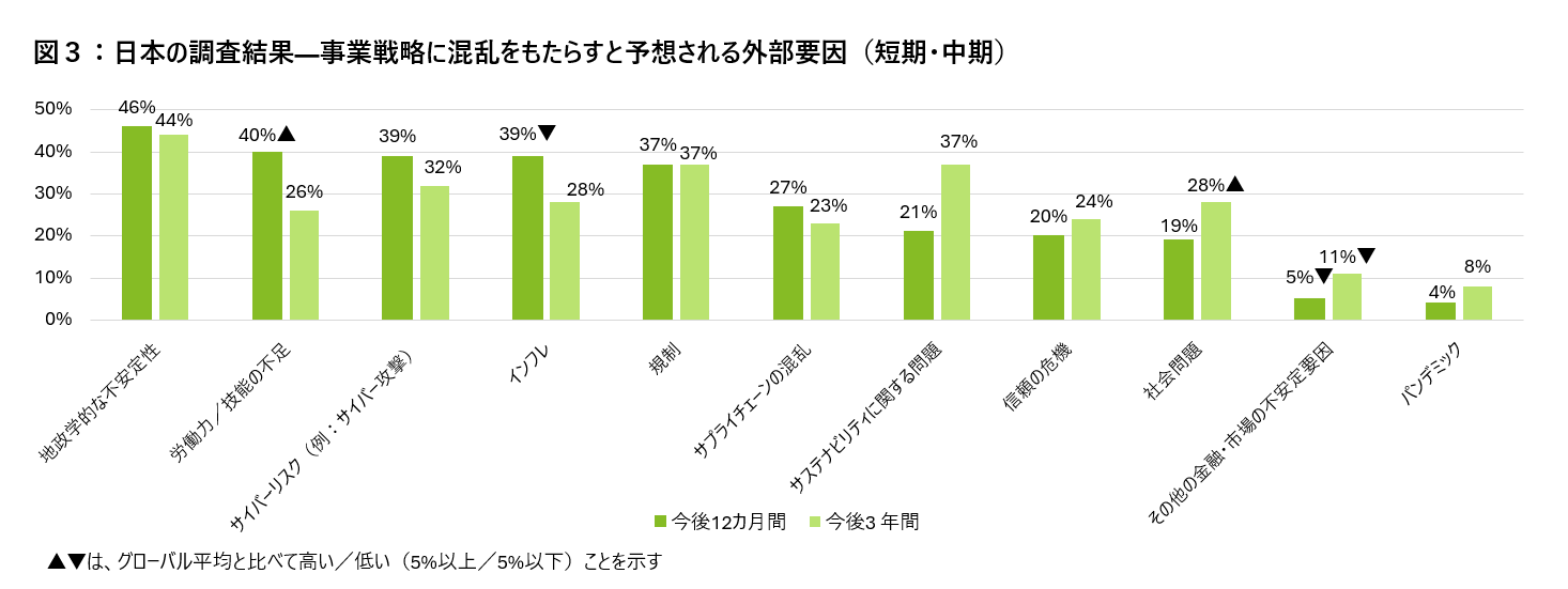 本調査では世界各地域の経営者の70%以上が短期的な自社業績について前向きな見方を示しました。他方、それに比べてグローバル経済の展望は、それぞれ10ポイント以上ダウンしており、楽観する割合が低くなりました。これは、予測可能な過去のパターンと変動する未来の併存、すなわち自社に近いコントロール可能な要因への楽観と、遠い外部要因への慎重さの対比として、調査対象リーダーの思考を顕在化しました。日本の経営者も同様の傾向を示しつつ、世界経済やAPEC地域経済の見通しについてより楽観的な傾向を示しました。