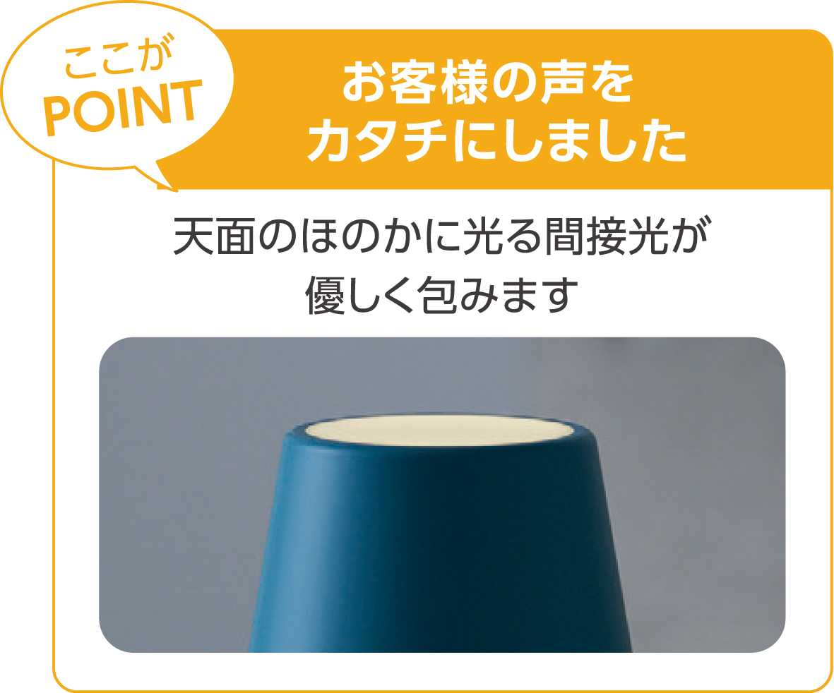 消灯時でもインテリアに馴染む丸みのあるデザインと、天面からほのかに漏れる間接光が癒やしの空間を演出します。