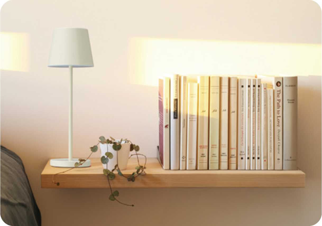 コードレスであることに加え、最長50時間※1の連続点灯と、約0.4kgの軽量ボディにより、リビングや寝室などで、電源を気にせず自由に明かりを楽しめます。お好みの明るさ・光の色にワンボタンで切り替えができるほか、天面からもほのかに光が漏れる間接光デザインにより、リラックスタイムを優しく演出します。