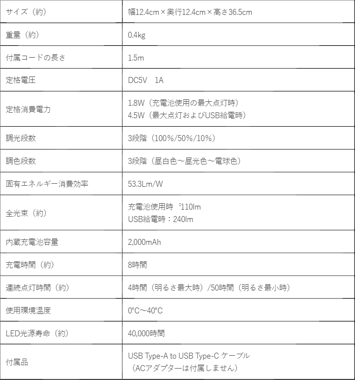 コンセントの位置を気にせず使える充電式。最長50時間※1の連続点灯が可能です。