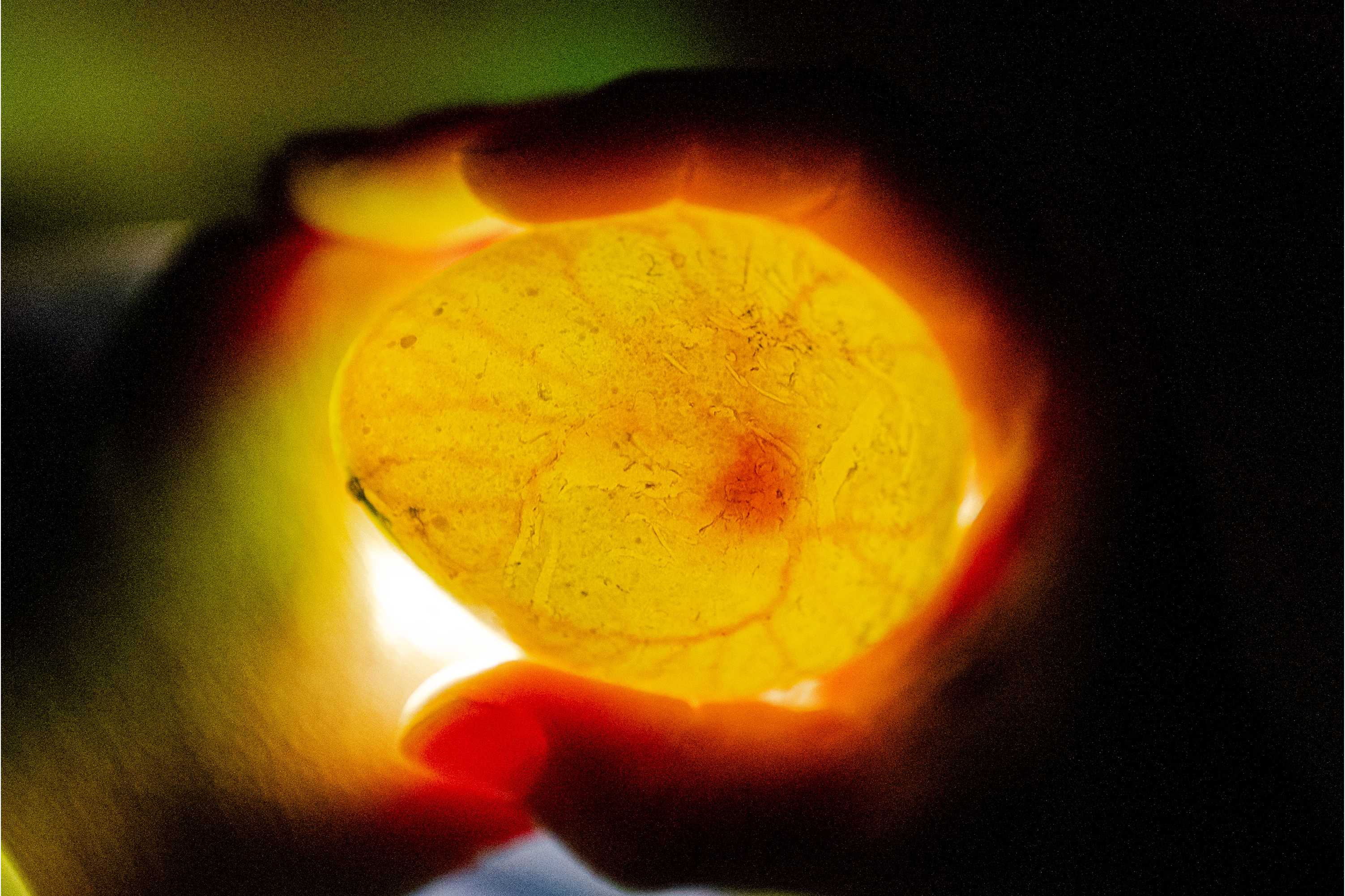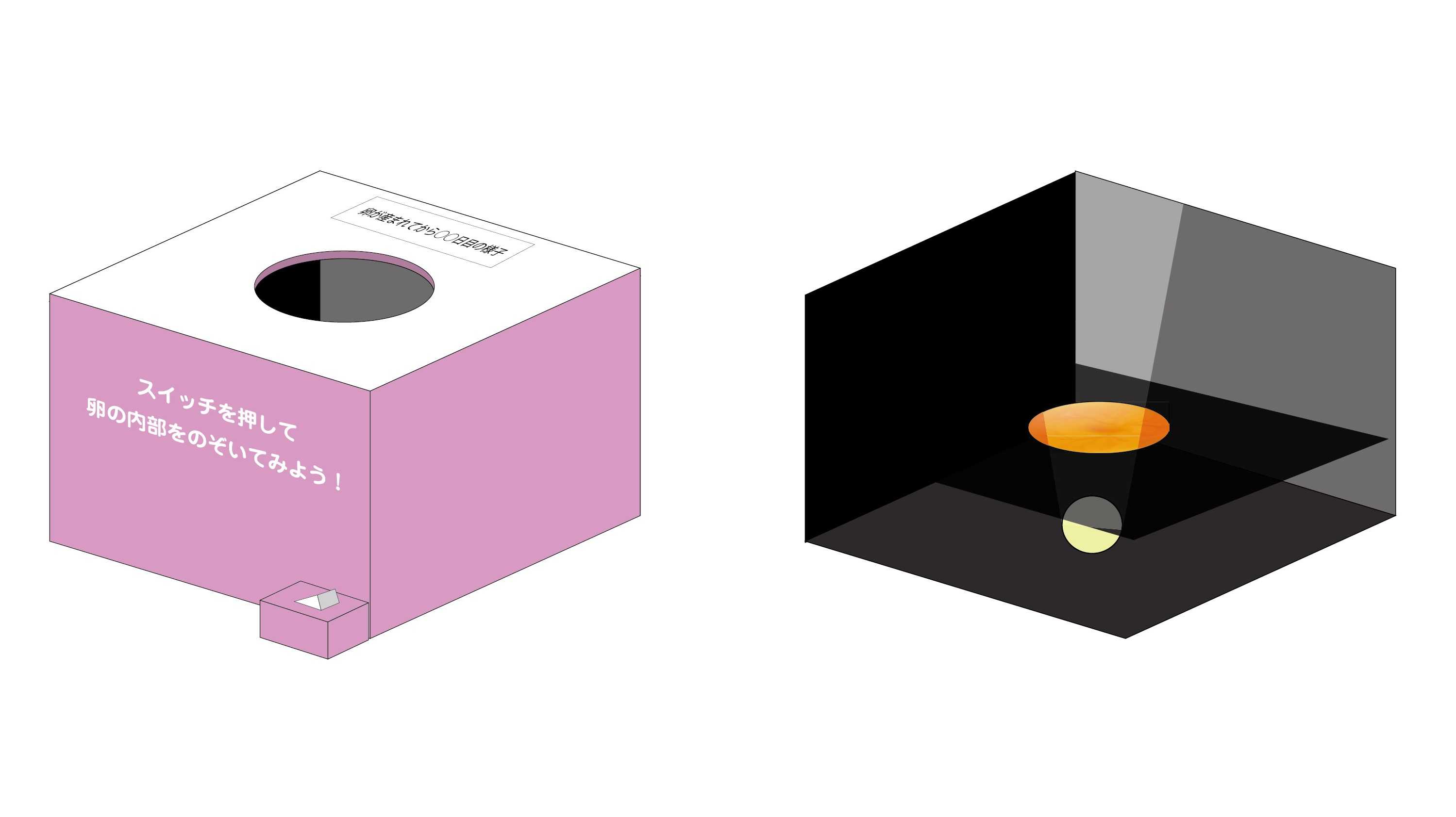 飼育スタッフが行う成長確認の作業の中から、卵にライトを当てて成長具合を確認する「検卵」作業を疑似体験できるボックスを設置します。ボックスのライトをつけて中をのぞき込むと、成長途中の卵の画像が浮かび上がります。卵の中で胚や血管が浮き出て見えるようすを観察してください。