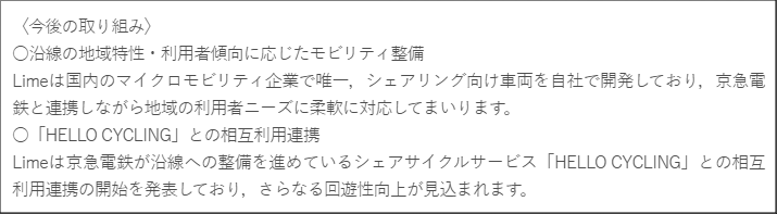今後も京急電鉄とLimeは,シェアモビリティのポート設置や利用促進を通じて,駅からの二次交通手段の充実を推進し,沿線価値向上を目指します。