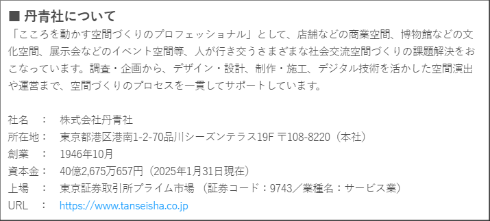 株式会社丹青社 広報室 担当:石綿、寺戸 Mail: pr-staff@tanseisha.co.jp Tel: 03-6455-8115