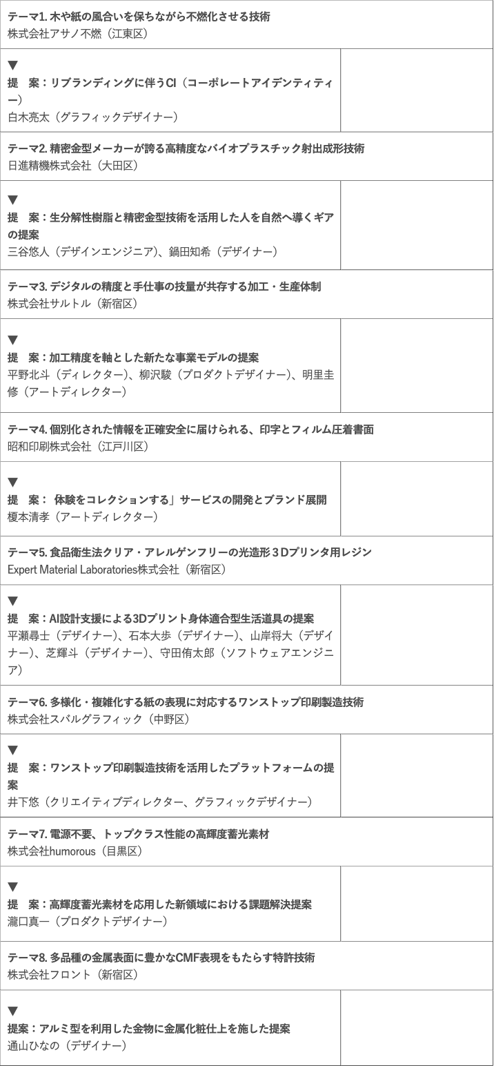 2月3日(火)に開催する提案最終審査会では、テーマ賞8件の具体案を発表します。成果物としてのデザインだけではなく、ぜひその成果物が生まれた経緯やプロセスに含まれるデザインもご注目ください。