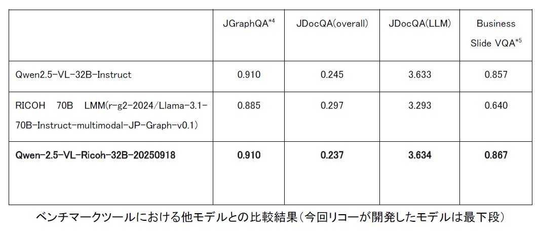 株式会社リコー(社長執行役員:大山 晃)は、中国のアリババクラウドが開発・提供する大規模言語モデル(LLM)ファミリーの「Qwen2.5-VL-32B-Instruct*1」をベースに、日本企業の図表を含むドキュメントの読み取りに対応したマルチモーダル大規模言語モデル(以下「LMM」)を開発しました。