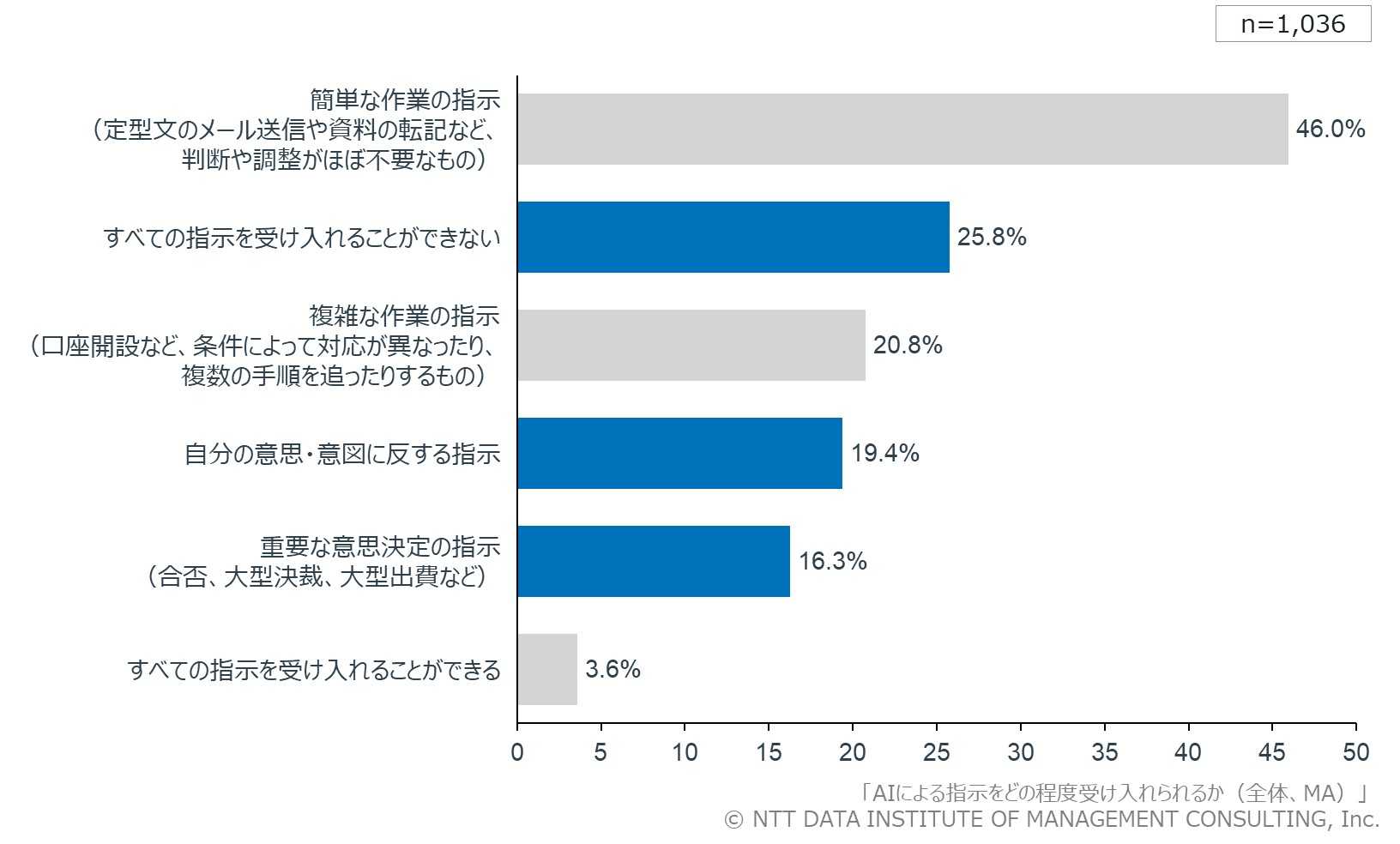 その結果、現段階で最も受け入れられているAIの指示は、判断や調整をほとんど伴わない「簡単な作業レベル」(46.0%)であることが明らかになりました。
