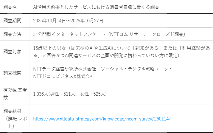 株式会社NTTデータ経営研究所(本社:東京都千代田区、代表取締役社長:山口 重樹、以下、当社)は、NTTドコモビジネスX株式会社(本社:東京都品川区、代表取締役社長:稲葉 秀司)が提供する「NTTコム リサーチ」登録モニターを対象に「AI活用を前提としたサービスにおける消費者意識に関する調査」(以下、本調査)を実施しました。