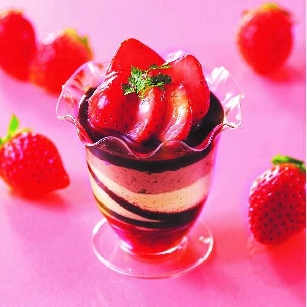 甘酸っぱい苺コンフィチュールに、ほんのりバニラ香る濃厚なバニラムース、ほろ苦い削りチョコ入りチョコクリームを重ね、お店でカットしたフレッシュ苺をトッピングしました。層ごとの味わいと食感が楽しめる、贅沢なショコラパフェです。