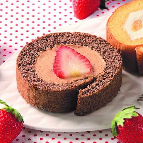 ふんわりと焼き上げた厚切りのココアスポンジで、たっぷりのショコラクリームとジューシーな苺を巻きました。