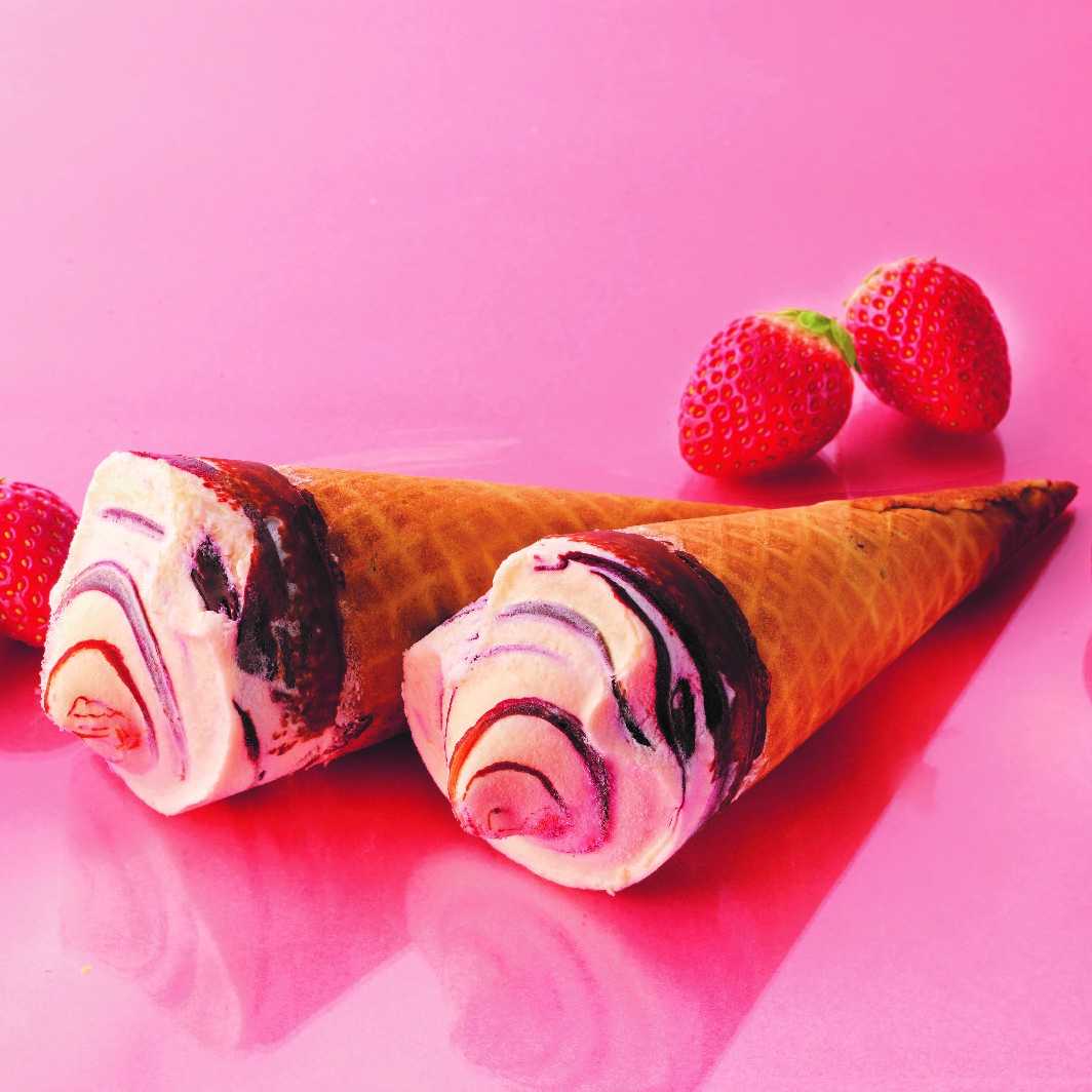 パリパリチョコと濃厚なストロベリーアイスクリーム、香ばしい自家焼シュガーコーンが織りなすコーンアイスです。甘酸っぱいストロベリーアイスとチョコの軽快な食感が絶妙に絡み合う、リッチで贅沢なソフトクリーム風アイスに仕上げました。濃厚なアイスとパリパリチョコ、コーンを一緒に味わえば、スイーツのようなとろけるひとときを楽しめます。