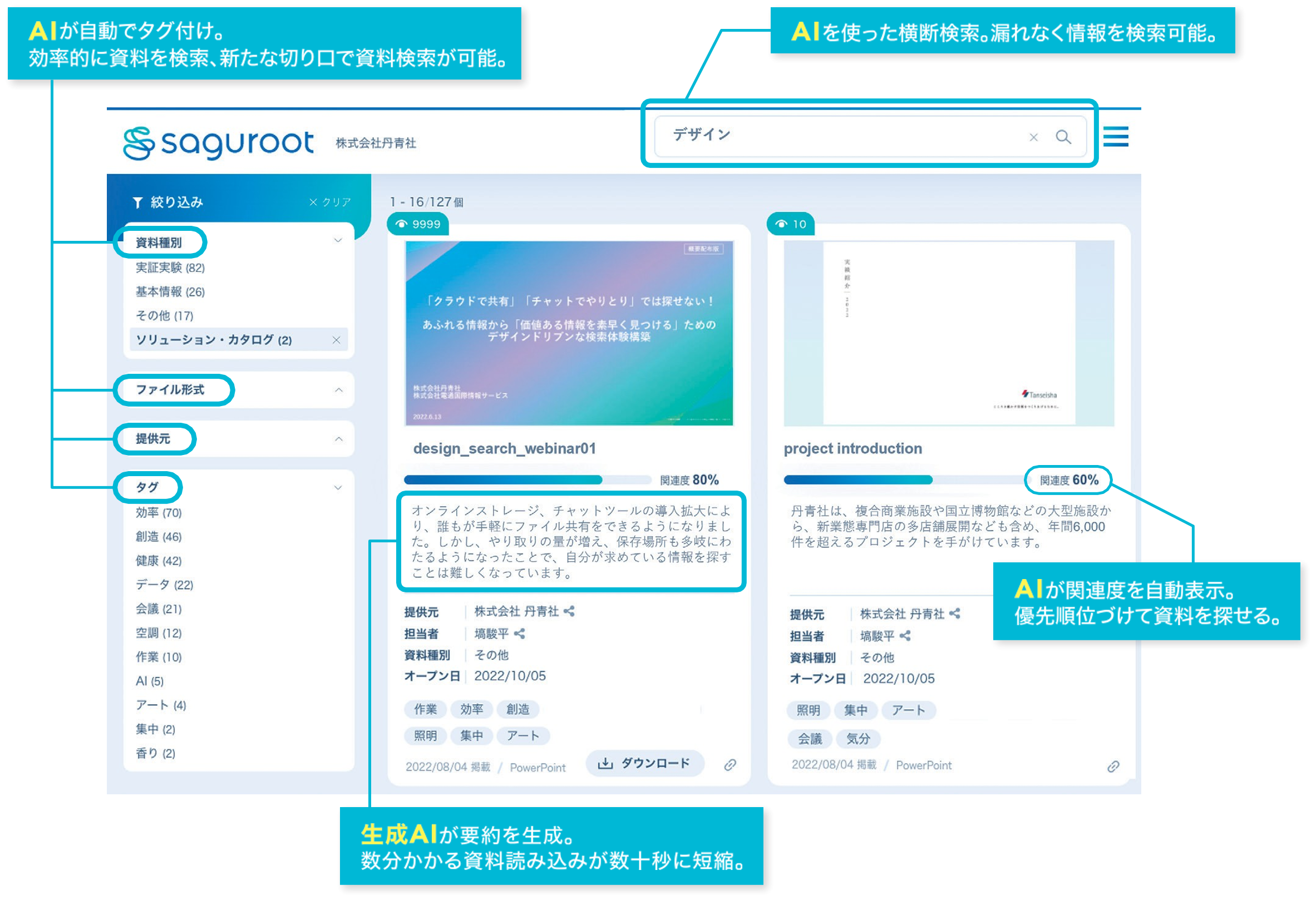 「saguroot」は生成AI・AIとデザインの力で、経験や知識の差を超えた検索体験の提供を通じて、イノベーションの創造と生産性の向上を支援します。