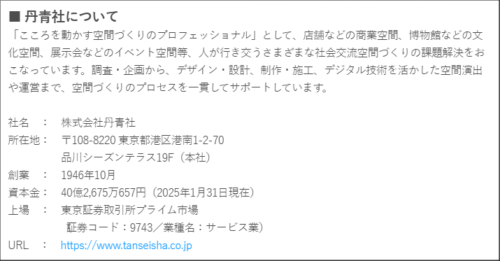 株式会社丹青社 広報室 担当:石綿、寺戸 Mail: pr-staff@tanseisha.co.jp Tel: 03-6455-8115