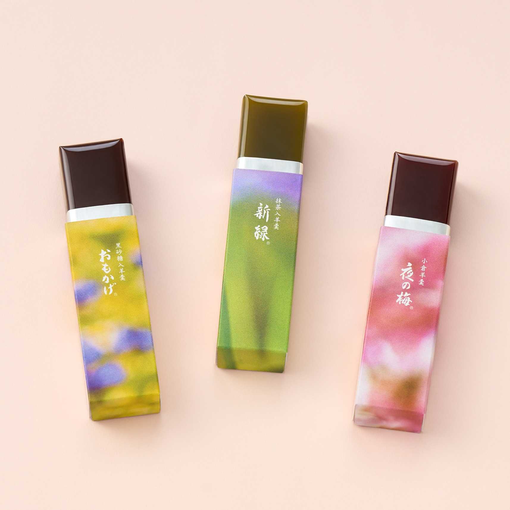 【種 類】小形羊羹(小倉『夜の梅』、黒砂糖入『おもかげ』、抹茶入『新緑』)