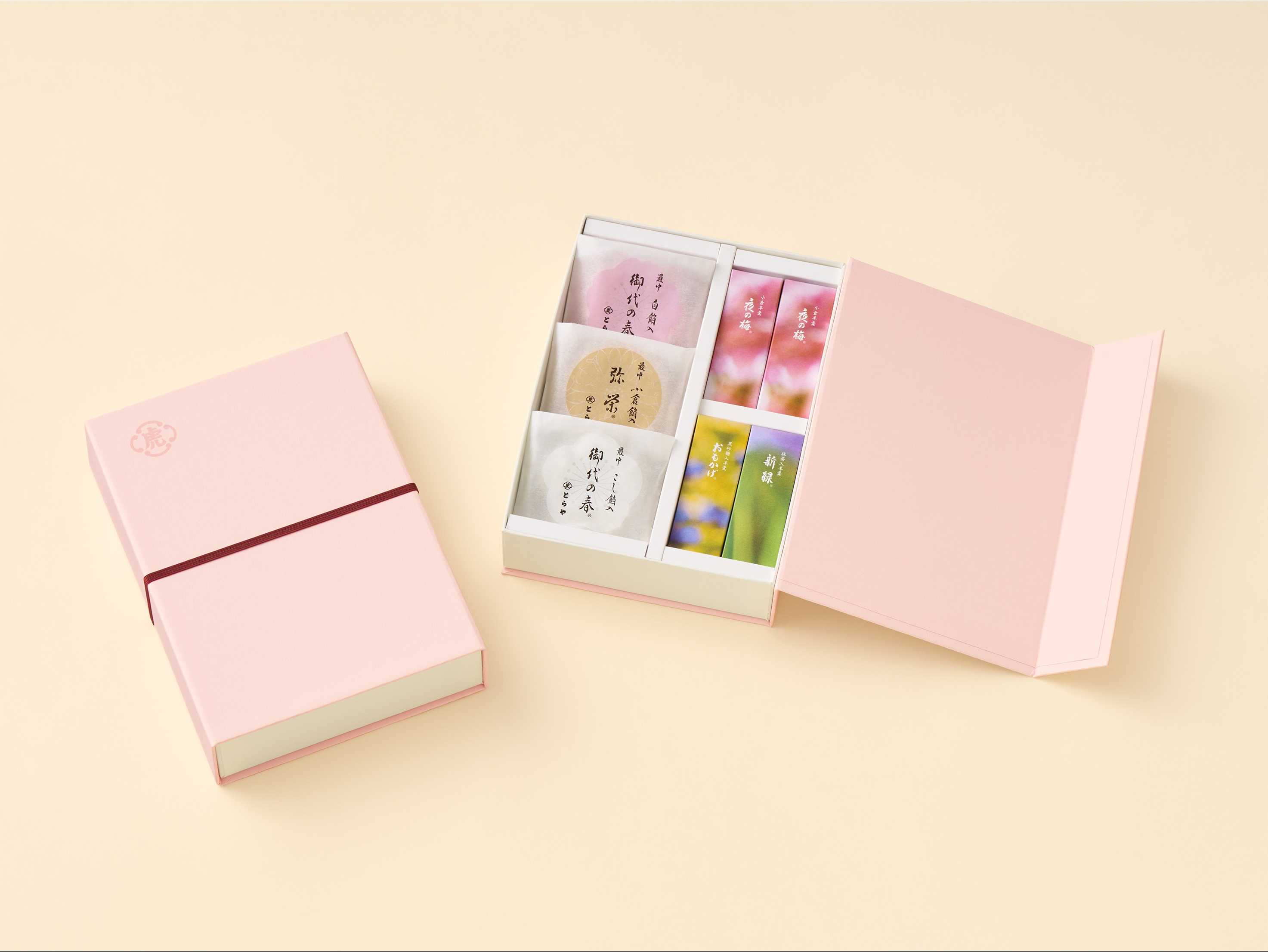 花鳥風月を切り取り、抽象的に表現する「菓子の意匠(菓子のデザイン)」に着想を得た本デザインは、抽象的な春の花の写真を配すことで、手にとる方の記憶にあるそれぞれの「春」が想起されるような表現に仕上げています。種類は小倉、抹茶、黒砂糖の3つ。良質な原材料と職人の技術でおつくりした羊羹は、しっかりとした食感と後味のよい甘さが楽しめます。