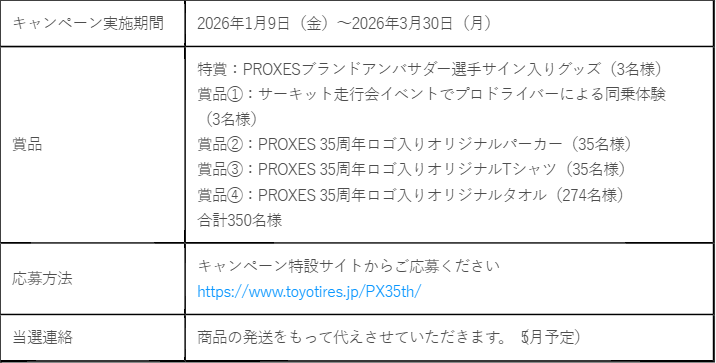TOYO TIRE株式会社(本社:兵庫県伊丹市、社長:清水隆史)は、グローバルフラグシップブランド「PROXES」が本年発売35周年を迎えることを記念し、オープン懸賞企画「PROXES 35thアニバーサリーキャンペーン」を実施しますのでお知らせいたします。