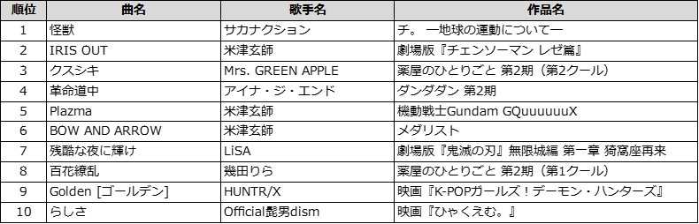そんな2025年、アニメ主題歌として最も歌われたのは、大みそかの『NHK紅白歌合戦』で繰り広げられた名演も記憶に新しいサカナクション「怪獣」だ。『チ。 ―地球の運動について―』のオープニング主題歌としての親和性/完成度もさることながら、活動休止をしていたバンドが活動を再開し、その復活を高らかに告げる会心のロック・ナンバーであったこともこの結果に与えた影響は大きい。では、2025年のアニメ主題歌カラオケランキングの本当の“顔”だったのは誰かと言えば、間違いなく米津玄師である。“劇場版『チェンソーマン レゼ篇』”の勢いに乗り世界的な大ヒットとなった「IRIS OUT」はもちろん、昨年最も国内のアニメファンを熱狂させた『機動戦士Gundam GQuuuuuuX』主題歌「Plazma」、そして羽生結弦とコラボレーションしたミュージックビデオも話題となった『メダリスト』オープニング主題歌「BOW AND ARROW」と、TOP10内になんと3曲も送り込んだ。1位こそ逃したものの、すべて同じ年にリリースされた新曲のみで成し遂げたこの記録を塗り替えるアーティストは今後現れないかもしれない。それほどの偉業と言えるだろう。