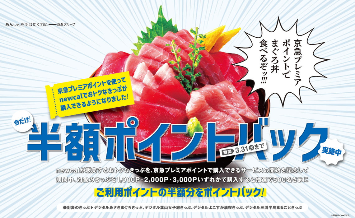 京浜急行電鉄株式会社(本社:横浜市西区,取締役社長:川俣 幸宏,以下 京急電鉄)は,2026年1月15日(木)15:00から,デジタルみさきまぐろきっぷ等のおトクなデジタルきっぷの購入に京急プレミアポイントの使用が可能になります。さらに,おトクなデジタルきっぷ購入に使用した半額ポイントを抽選で500名さまに還元するキャンペーンも開催いたします。